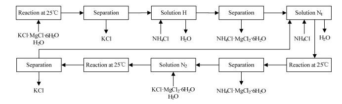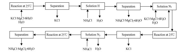 图 7 以25℃ KCl-MgCl2-NH4Cl-H2O相图为基础制备铵光卤石工艺(b)示意图 Fig.7 Flow chart of NH4Cl·MgCl2·6H2O production (b) based on the phase diagram of the KCl-MgCl2-NH4Cl-H2O system at 25℃ |