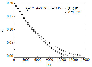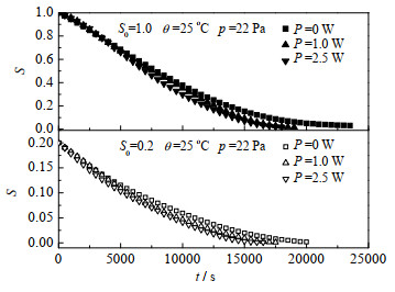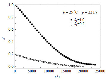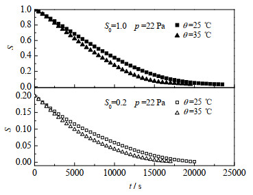 4 结果与讨论 4.1 初始非饱和物料对冷冻干燥过程的影响在典型操作条件(25℃,22 Pa)下,采用石英底盘,实验测试了2种不同饱和度样品的冷冻干燥过程,结果如图 4所示。从图中可以看出,饱和样品(S0=1.0)与非饱和样品(S0=0.2)的干燥时间分别为23 500与20 000 s,非饱和物料比饱和物料干燥时间缩短了14.9%。初始非饱和物料能够有效强化冷冻干燥过程。这一结论与本课题组以前的实验研究结果相一致[15, 17, 32]。干燥时间的缩短意味着设备运行时间的缩短和能耗的降低。对于饱和物料,随着升华界面的缓慢退却,内部冰晶得以升华。但是,由于冰晶升华后的孔道较小,使得传质阻力较大。而对于非饱和物料,其内部存在的初始孔隙可为水蒸气的迁移提供便捷的通道,在一定程度上增大了多孔介质有效扩散系数,减小了传质阻力,促进了传质过程。此外,实验考察了2种物料干燥产品的水质量分数。初始非饱和物料产品中水的质量分数为1.45%,远小于饱和物料的4.66%。干燥产品具有较低的水质量分数有利于产品长期保存。需要特别指出,无论是观察干燥曲线还是干燥产品外观,干燥过程中都没有出现物料崩塌现象。还需要说明,文中所有实验均做了重复实验,结果显示重复性非常好,验证了结果的可靠性和准确性。