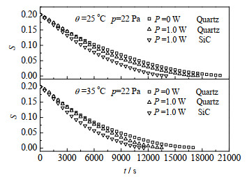 3.2.2 实验步骤本实验采用辐射加热和组合加热(辐射+微波) 2种加热模式。典型操作条件为:干燥室辐射温度θ=25 ℃,干燥室压力p=22 Pa。微波源发射功率设定为5 W,显示反射微波功率为4 W,故样品吸收和无效损耗功率P合计为1 W。操作步骤简述如下: