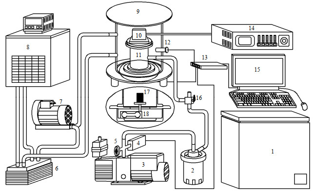 图 2 冷冻干燥实验装置流程图 Fig.2 Flow diagram of freeze-drying experimental apparatus 1. freezer 2. cool trap 3. vacuum pump 4. pressure sensor 5. regulating valve 6. heat exchanger 7. ring blower 8. circulator 9. heating cabinet 10. coaxial-to-waveguide transducer 11. microwave drying chamber 12. infrared sensor 13. date acquisition card 14. microwave solid-state source 15. PC 16. three-way valve 17. sample mold 18. load cell |