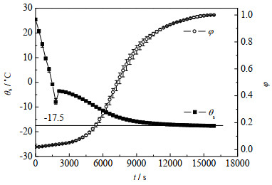 咖啡溶液的共晶温度测量结果如图 3所示。图中2条曲线分别为样品温度θs和样品相对电阻率φ随时间t的变化。从图中可以看出,在t < 1 800 s时,样品温度从室温开始不断降低。在t≈1 500 s时,样品温度达到水的冰点,而样品仍未冻结;温度继续降低,在t=1 800 s时达到-8 ℃,这个阶段称为过冷阶段。由于样品过冷度较高,当t > 1 800 s时,冰晶开始成核并生长,释放出结晶热,样品温度快速上升,在t=2 100 s时样品温度升高到-4 ℃,在温升时冰晶停止生长,这个阶段称为一次成核阶段。在这2个阶段中,有较多带电离子可以自由移动,溶液的导电性良好,电阻率缓慢上升[31]。在t > 2 100 s时,由于冷阱不断提供冷量,样品温度又开始下降,冰晶持续生长,这个阶段称为二次成核阶段。在这一阶段,更多液态水转化为冰,自由电荷被束缚,电阻率开始快速升高。随着溶液被进一步浓缩,离子强度逐渐增强,溶液最终形成共晶或因黏度过高而转变成无晶型固体[15, 32]。此时电阻率达到最大值,对应的温度为共晶温度[33]。从图 3中可以看出,最大电阻率对应的咖啡溶液共晶温度为-17.5 ℃。