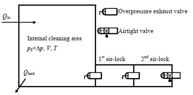 2 物理模型与理论基础 2.1 物理模型根据防护工程的实际状况,建立如图 1所示的密闭空间超压过程物理模型。内部清洁区体积为V,m3;压强为p0+Δp;外部压强为大气压p0;进风量为Qin,漏风量为Qleak。为简化分析过程,对超压过程进行如下假设:1)内部清洁区与外部染毒区的温度相等且保持恒定;2)气体扩散对超压过程的影响可忽略。