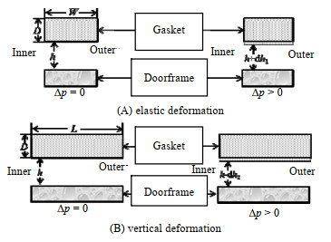 密封垫因间隙面受力而发生压缩(图 2(A)),导致间隙变大,假设形变为dh1,弹性模量为E,可知