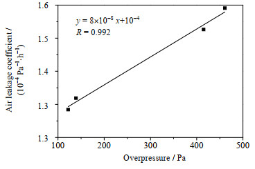 图 3 案例工程中漏风系数与超压值的拟合曲线 Fig.3 Fitting curve of air leakage coefficient and overpressure in practical case |