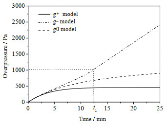 根据式(25)可获得超压值随时间的变化曲线(见图 5)。在起初阶段,3条曲线比较接近。随着时间增加,3条曲线差异逐渐变大。“g+模型”曲线走势先上升,随后接近稳定值。“g-模型”在前期(t < t1)增势较缓,随后趋于相对陡峭。“g0模型”曲线介于“g+模型”、“g-模型”两条曲线之间,随时间增加而缓慢趋于水平。根据实测结果和调试经验,防护工程内超压值一般均会达到稳定,因此“g+模型”与“g0模型”更接近实际。