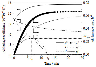 因此,在“g-模型”中漏风系数k-和漏风率m-的变化可分为3个阶段:起初阶段(t ≤ tmax),漏风系数k-呈线性减小,漏风率m-缓慢增加至最大值