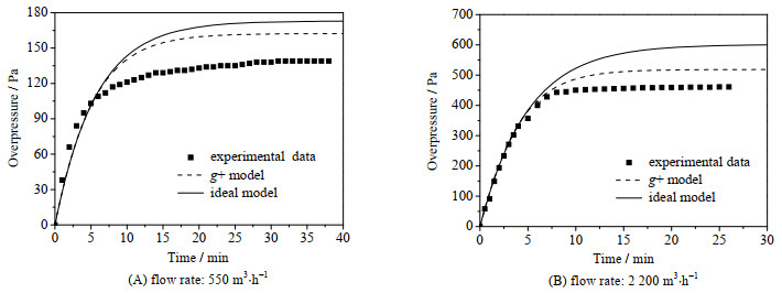 4 超压过程数学模型验证将“g+模型”和“理想模型”预测的超压过程与实测结果对比,见图 7。2种模型预测的超压过程与实测结果走势一致,但预测极限超压值均比实测值高,主要源于2个模型都忽略了风管阻力和扩散作用。当进风量为550 m3·h-1时,“g+模型”和“理想模型”极限超压值分别为162.3和173.0 Pa,比实测值139.0 Pa高出16.8%和24.4%。当进风量为2 200 m3·h-1时,“g+模型”和“理想模型”极限超压值分别为518.4和691.8 Pa,比实测值461.0 Pa高出12.5%和50.1%。进风量较小时,风管阻力和扩散作用对超压过程的影响比较显著,漏风系数的影响相对较小,“g+模型”相对“理想模型”的优势不太突出。进风量较大时,风管阻力和扩散作用对超压过程的影响相对减小,漏风系数的影响显著增加,“g+模型”相对“理想模型”的优势比较突出。此外,密封面实际磨损情况比较复杂,存在褶皱,老化无弹力,甚至部分缺失等情况,将此简化为弹性平板间隙,势必造成一定误差。然而,对比分析表明,“g+模型”比“理想模型”更接近实测结果,因此前者能够更准确地预测实际工程的超压过程。