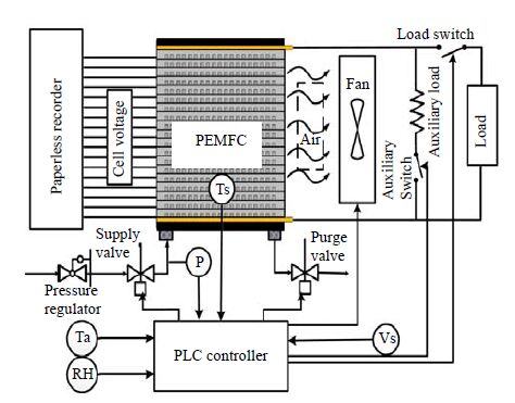 2 实验方案 2.1 实验系统实验系统如图 1所示,所用PEMFC为加拿大Ballard公司FCgen1020ACS空冷自增湿型PEMFC,单电池数13片,额定功率500 W,额定工作电流65 A,最大工作电流75 A,工作温度上限为75℃,PEMFC配备2个DC 24 V/1.5 A的可调速风扇对电堆进行散热和供氧。负载采用ITECH公司的IT8816B,功率为600 W。PLC控制器利用辅助开关控制辅助负载的切入和断开。利用KT848R无纸记录仪采集和记录PEMFC单电池电压。PLC控制器采集环境温度 Ta ,环境湿度 RH ,电堆温度 Ts ,电堆电压 Vs ,电堆电流 i ,氢气压力 P 等参数,并控制风扇转速,阳极氢气进气阀、排气阀、负载开关和辅助负载开关的开启和闭合,保证电堆工作在合理状态。