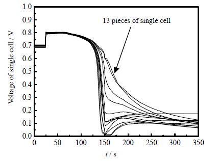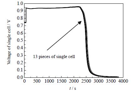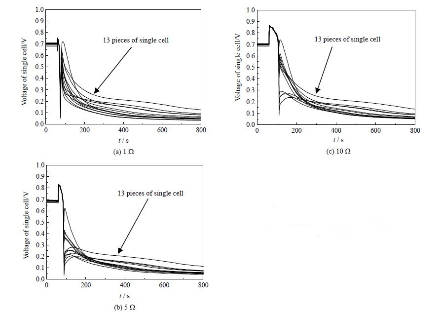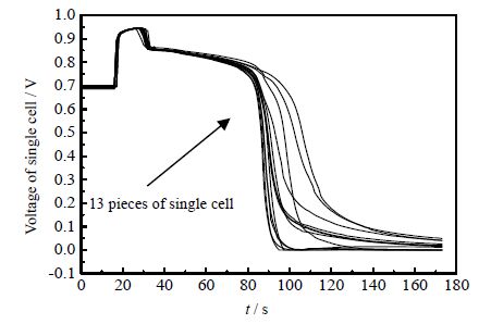 在燃料电池的实际操作中,对PEMFC停机过程中单电池电压的控制是非常有必要的,这是为了防止单电池电压下降过快而导致单电池反极现象的发生。因此,本实验中通过上位机和无纸记录仪监控电堆中各个单电池电压,当电堆中电压最低的单电池快反极时,切断辅助负载,以防止单片电池反极对电堆性能造成负面影响。将图 3和图 2对比,可以发现,辅助负载的使用不仅可以加快残留在电堆阳极侧氢气的消耗速度,同时也缩短了电堆各单片电池维持高电压的时间,这必然能有效地保护催化剂碳载体和延长电池寿命。但是在PEMFC实际停机过程中,若PEMFC各单片电压均衡性不好,某些性能较差的单片电池很可能出现反极现象。其原因在于如果将辅助负载应用于整个电堆,当某一片或多片单电池不能获得足够的氢气时其电压就会迅速下降,而此时整个电堆电压还处于比较高的水平,外接的辅助负载还会从电堆中抽取电流,这就会导致残留氢气不足的单电池出现由提供能量变成消耗能量的情况,被动的抽取电流,从而出现单电池反极现象。因此,必须确保电堆中最小单片电池电压反极化前将辅助负载切除。若燃料电池电堆中某片性能很差,停机过程中该单片电压会降得过快,为了防止其反极化,从而过早的切除停机负载,大大降低了停机电阻的放电效率。