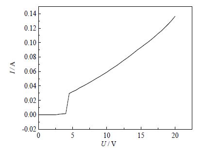 电堆自身的散热风扇是非线性感性负载,电堆放电过程中其阻抗值在实时变化,相当于一个动态的放电负载。风扇放电的 U - I 特性曲线见图 5。风扇其本质是一个直流电机,当风扇两端的电压低于5 V时,风扇不转动,此时电流接近零,可以当作此时风扇已被切开电源。当风扇两端的电压高于5 V时,风扇转动起来,并且随着电压的增加转速越来越快,此时风扇以热能和动能两种形式消耗电能,动能为主要的消耗形式。