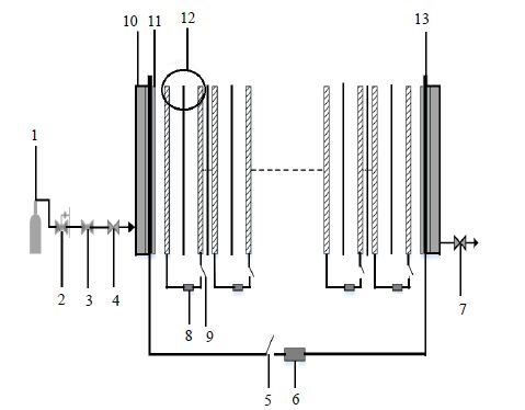 图 6 单电池单独放电电堆整体结构 Fig.6 The overall structure of stack with resistance for the single cell 1. hydrogen storage tank 2. pressure reducing valve 3. pressure stabilization valve 4. hydrogen inlet valve 5. load switch 6. load 7. outlet valve 8. auxiliary load 9. auxiliary load switch 10. end plate 11. insulation board 12. single cell 13. electrode |
