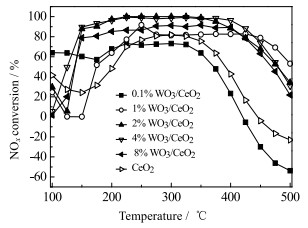图 1 WO3/CeO2催化下NH3-SCR反应的NOx转化率 Fig.1 NOx conversion of NH3-SCR reaction catalyzed by WO3/CeO2 |