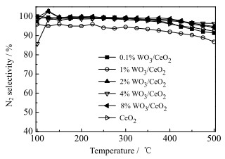 图 2 NH3-SCR反应中WO3/CeO2催化剂的N2选择性 Fig.2 N2 selectivity of NH3-SCR reaction catalyzed by WO3/CeO2 |