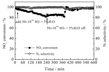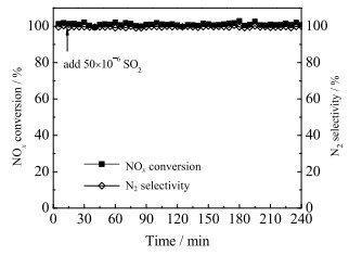 图 3 4% WO3/CeO2的抗SO2中毒性能 Fig.3 Anti-SO2 poisoning performance of 4% WO3/CeO2 |