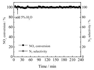 图 4 4% WO3/CeO2的抗H2O中毒性能 Fig.4 Anti-H2O poisoning performance of 4% WO3/CeO2 |
