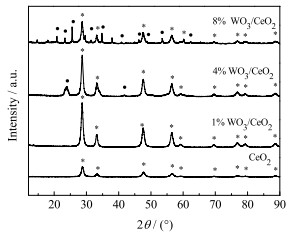 CeO2、1% WO3/CeO2、4% WO3/CeO2、8% WO3/CeO2的XRD表征结果如图 6所示,在2θ为28.7°、33.3°、47.6°、56.5°、59.2°、69.6°、76.7°、79.1°、88.4°处所有催化剂均出现了X射线衍射峰,分别对应于CeO2的(111)、(200)、(220)、(311)、(222)、(400)、(331)、(420)、(222)晶面,这表明纯CeO2催化剂和不同WO3掺杂改性的CeO2催化剂晶体均为立方萤石晶体结构[15]。但是,WO3掺杂改性使得CeO2的峰值强度变大,根据谢乐计算公式可知CeO2立方体的晶体尺寸变大。由于W6+离子半径(0.06 nm)小于Ce4+离子半径(0.09 nm),推测负载的WO3没有掺入CeO2晶格中形成固溶体[16],所以,图 6中的衍射曲线上既未观察到由于WO3掺杂改性引发的立方萤石结构CeO2衍射峰的明显移动,也未观察到CeO2混合固溶体(例如Ce2(WO4)3或钨酸铈)的新衍射峰。然而,当WO3负载量继续增加至4% 时,检测到单斜WO3晶体特征峰,如图中·处所示,并且WO3衍射峰强度随其负载量增多而增强,说明其分散度在下降[17],且部分WO3在CeO2表面发生团聚,但是4% WO3/CeO2催化剂出现的2个WO3晶体特征峰仍表现出最佳的NH3-SCR催化性能,说明WO3的团聚并不是导致高含量WO3掺杂催化剂活性降低的关键因素。