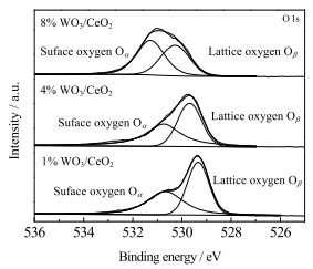 图 7、8和9考察了1% WO3/CeO2、4% WO3/CeO2、8% WO3/CeO2催化剂的X射线光电子能谱图(XPS)。其中O 1s图谱如图 7所示,Oβ表示晶格氧的能谱峰,Oα表示表面化学活性氧(─OH, O2)的能谱峰[18-19]。表面化学活性氧升高有益于催化剂将NO氧化为NO2、促进“快速SCR”(fast-SCR)反应的发生,从而能够大幅度提高中低温催化活性[20-21]。通过峰面积分别对不同氧物种进行定量分析,积分计算出1% WO3/CeO2、4% WO3/CeO2、8% WO3/CeO2的表面化学活性氧占比Oα/(Oα+Oβ)依次为46%、52%、46%,很明显4% WO3/CeO2表面化学活性氧最多、催化活性最好,这表明表面化学活性氧对SCR反应过程至关重要。