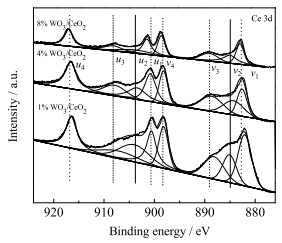 图 8 WO3/CeO2的X射线光电子能谱Ce3d Fig.8 X-ray photoelectron spectroscopy results of WO3/CeO2 Ols Ce3d |
