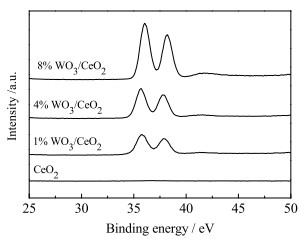 图 9为CeO2、1% WO3/CeO2、4% WO3/CeO2、8% WO3/CeO2的W4f图谱,处于32~40 eV的2个主峰代表W4f 7/2(大约35.6 eV)和W4f 5/2(大约37.6 eV),均为W6+的能谱峰[24]。由图可见,随着WO3掺杂量增加,W4f 7/2和W4f 5/2的峰面积增大。