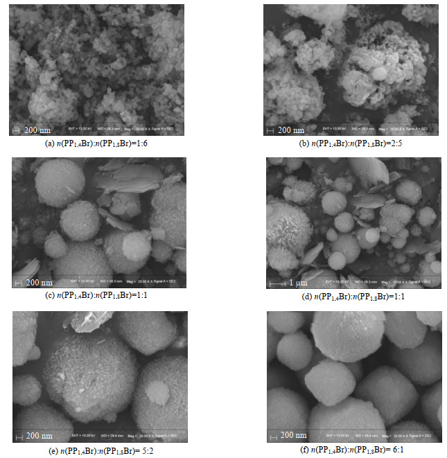 从图 3中可以看出,当n(PP1, 4Br)/n(PP1, 8Br)=6:1时,相较于其他条件下合成的ZSM-11分子筛,晶粒较大,小晶粒较少,晶粒表面呈短的纤维状结构;当n(PP1, 4Br): n(PP1, 8Br)=5:2时,相同标尺下与其他条件下合成的晶粒相比,其尺寸最大,偶尔有较小晶粒出现,晶粒表面呈粗糙的颗粒状;当n(PP1, 4Br): n(PP1, 8Br)=1:1时,PP1, 8Br含量增加,此时,球形晶粒尺寸更小,晶粒表面依然为粗糙颗粒状,同时,出现较多片状晶块(图 3(c)、(d)),片状晶块呈片层状,表面较球形晶粒光滑,可能是由于PP1, 8Br的表面活性作用,改变了目标微球的形貌特征[11],即由球形变为片层堆积的块状;当n(PP1, 4Br)/n(PP1, 8Br)=1:6和n(PP1, 4Br)/n(PP1, 8Br)=2:5时,合成物为细小的颗粒,没有明显的ZSM-11晶型,说明随着PP1, 8Br含量的继续增大,PP1, 8Br与PP1, 4Br之间的协同作用减弱,不能很好地起到模板作用,因此无法得到ZSM-11晶型,此结果与XRD结果相呼应。