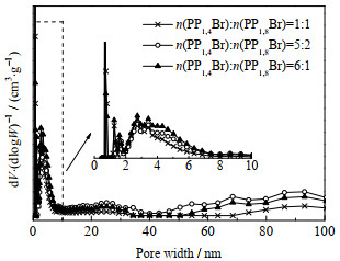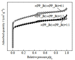 从图 4中可以看出,当n(PP1, 4Br)/n(PP1, 8Br)=6:1时,在相对压力p/p0较小时,曲线直线上升,N2吸附量快速增长,迅速达到饱和状态,说明晶体样品具有较多的微孔孔道结构;当相对压力为0.5附近有明显的滞后环,这是由于发生了中孔毛细管现象,证明分子筛中存在均匀分布的介孔;n(PP1, 4Br)/n(PP1, 8Br)为5:2和1:1时制得的分子筛,在相对压力较低时曲线依然为直线上升,虽与n(PP1, 4Br)/n(PP1, 8Br)=6:1制得的分子筛有所差别,仍可证明其存在大量的微孔结构;3条曲线在相对压力p/p0达到0.9时,均出现一定程度的跃升,说明分子筛内有一定的介孔或较大孔存在。