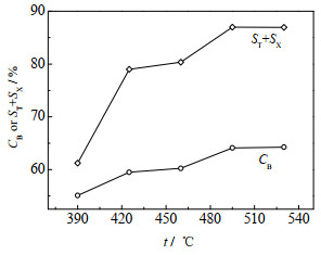 图 8为苯的转化率CB和甲苯、二甲苯的总选择性ST+SX随温度的变化曲线。