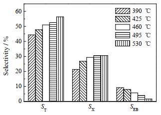 从图 9中可以看到,ST和SX均随着温度的升高而逐渐增加,而SEB在495~530 ℃时,变化趋势不明显,发生这一现象可能是因为生成二甲苯的反应是放热可逆的连串反应,当温度到495 ℃以上时,二甲苯已达到该反应条件下的平衡[16];副产物乙苯随着反应温度的提高,其选择性SEB下降,这是由于主反应选择性增加,乙烯浓度降低造成的。综合来看,本催化剂所考察的范围内,要得到较多的苯和二甲苯,应控制温度在495 ℃以上较好。