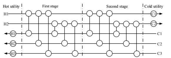 2 换热网络数学模型理论上分流比不分流的换热网络模型包含更为丰富的网络结构,得到最优换热结构和参数的可能性较大,但最优解对优化算法的性能要求很高。对于相同规模的换热网络综合问题,无分流模型相对于有分流模型具有较少的优化变量和约束条件,模型较为简单且不需要增加阀门、管路等新的费用项目。由于无分流模型并没有引入流股分流比优化变量,若单用CS算法则只需对流股匹配位置处的换热量(或换热面积)进行具有Lévy flights随机特性的增大或缩小优化,无需对流股分流比优化变量进行优化,因此在求解复杂换热网络综合问题时,CS算法的搜索时间成本和求解精度会得到一定控制和保证,能够在可接受的时间范围内得到较优的无分流网络结构设计,且部分设计的年综合费用甚至会低于文献中有分流的网络结构设计。基于此,本文采用无分流分级超结构模型[3],以NH=2股热流体和NC=3股冷流体为例,设置级数NS=2,如图 1所示。