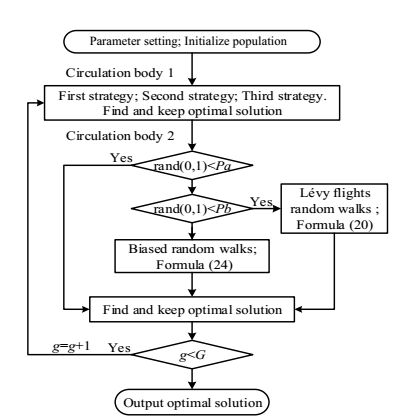 如果rand (0, 1) >Pa,则产生一个随机数rand (0, 1);如果rand (0, 1)<Pb,则采用偏好随机游走组件更新解,更新公式为(24)。否则,采用Lévy flights随机游走组件更新解,更新公式为(20);此处Pb为选择更新概率,取Pb=0.5,则循环体2过程以相等概率强化个体自身的进化(Lévy flights随机游走)和增进个体间信息的交流(偏好随机游走),从而增强种群个体的多样性,给循环体1更多结构进化空间,避免在进化后期算法因种群多样性缺失而过早收敛。