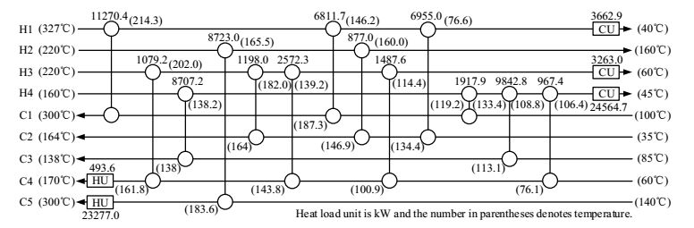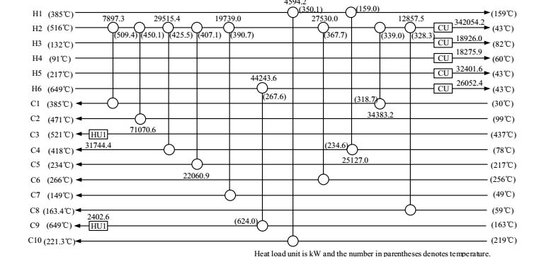 图 5 算例 2 最优网络结构图 (TAC=7,243,518 $·a-1) Fig.5 Optimal HEN structure of case 2 (TAC=7,243,518 $·a-1) |