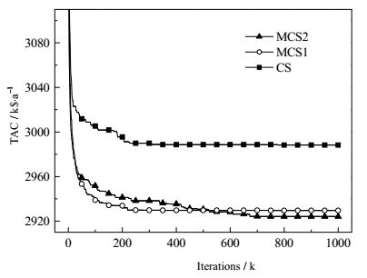 图 4 CS、MCS1和MCS2的最小TAC进化曲线 Fig.4 Evolution profiles of the minimum TAC by CS, MCS1, MCS2 |