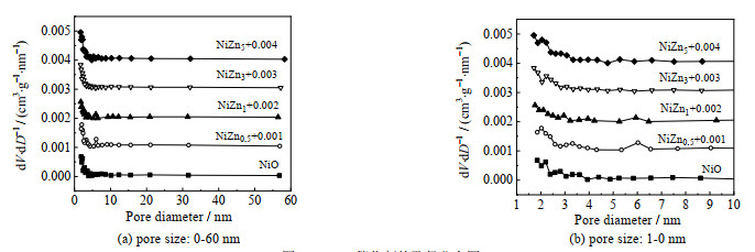 图 2 NiZnx催化剂的孔径分布图 Fig.2 Pore size distributions of NiZnx catalysts obtained by BJH calculations |