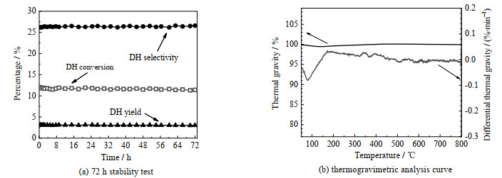 表 2还包含了不同Zn含量的NiZnx催化剂的产物分布。1, 3-丁二烯,1-丁烯的收率随Zn的添加而提高,但其增幅随Zn含量的增加先增大后减少。副反应燃烧产物CO2的收率在n(Zn): n(Ni)=1:1时最大,为7.8%。同时,在该系列催化剂上丁烷的裂解反应也很明显,裂解产物包含甲烷、乙烷、乙烯、丙烷与丙烯,加入Zn元素后,催化剂上存在较多的裂解活化中心位,进一步调控Zn的含量或者Zn氧化物的结构,是提高产物收率的一种途径[19-20]。图 3(a)为催化性能最好的NiZn0.5样品的稳定性考评,连续反应72 h后该样品的活性几乎不变,表现出了优良的稳定性。图 3(b)为NiZn0.5样品反应72 h后的热重分析结果,升温前后样品质量几乎不变,说明加入Zn后催化剂的抗结焦能力大大增强。