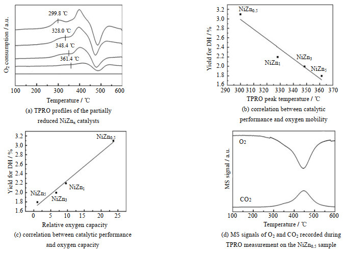 图 4(a)为NiZnx催化剂的TPRO曲线。其中的低温峰是催化剂的再氧化峰,其峰温决定了催化剂中氧的再生能力,催化剂再氧化温度越低,其越容易被氧化,氧移动性越好[13-16],同时,该低温峰的峰温和峰面积分别体现了反应过程中的氧补充速率和催化剂的氧容量,较低的TPRO峰温和较大的TPRO峰面积分别对应较高的氧补充速率和较大的氧容量。纯NiO催化剂在反应过程中结焦严重,几乎没有催化性能。为了与其他催化剂的氧移动性能进行对比,这里把纯NiO催化剂的氧消耗量为0。图 4(b)将TPRO低温峰的峰温与催化性能相关联,在Zn含量(摩尔分数)为0.5时,催化剂的TPRO峰温最低,为299.8 ℃,此时催化剂的催化活性最好。然而随着Zn含量逐渐增多,催化剂的TPRO峰温也越来越高,催化剂的性能愈加下降。图 4(b)表明,在该反应体系的整个氧移动过程(消耗‒迁移‒补充)中,气相氧转变为晶格氧的补充速率是影响催化效果的关键。