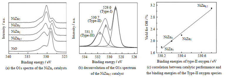 通过XPS进一步探究了催化剂表面氧的性质,并与氧移动性能关联。图 5(a)为NiZnx催化剂的O1s谱图,其中NiZn0.5样品的O1s谱图分峰结果如图 5(b)所示,催化剂表面有3种不同的氧,按结合能由高到低分别为第Ⅲ类、第Ⅱ类、第Ⅰ类氧。第Ⅰ类是催化剂表面上的强结合氧,第Ⅲ类氧物种是催化剂表面的弱结合氧,第Ⅱ类为与丁烷氧化脱氢活性密切相关的活性氧[13-16]。第Ⅱ类氧的结合能大小是影响催化剂的氧移动性强弱的关键因素。第Ⅱ类氧的结合能越大,说明该活性氧越活泼,催化剂的氧移动性越强。对NiZnx催化剂O1s谱图分别进行分峰处理,获得的三类氧结合能大小如表 4所示。NiZnx催化剂的第Ⅱ类氧结合能大小存在明显差异,将表 4中第Ⅱ类氧结合能的大小与催化性能作关联图,如图 5(c)所示。在Zn含量为0.5时,催化剂的第Ⅱ类氧结合能最大,此时催化剂的性能最好,这与TPRO表征结果一致。