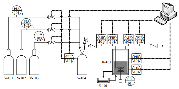 2.5 脱硫溶液失活评价脱硫溶液失活评价装置主要由溶液吸收系统、温度控制系统、压力控制系统、气体供给系统、在线分析系统和数据采集系统组成,如图 1所示。根据脱硫溶液的实际工况选择溶液吸收系统的工作温度为28 ℃,工作压力为5.4 MPa,有效容积为300 mL,内置磁力搅拌器和鼓泡吸收管,利用温度控制系统对它的温度进行控制,控温范围为5~95℃,恒温波动不大于0.05℃,通过前、后背压阀控制它的压力,控压范围为0~10 MPa,精度可达±0.1 MPa。分别将PT100型温度变送器、3051TA型压力变送器、LXI-B型气体流量计以及EC9820型二氧化碳在线分析仪、EC9852型硫化氢在线分析仪经数据采集系统与微型计算机相连,对整个装置的运行状况进行监视和调整。