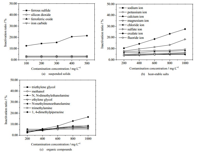 4 结论(1) 造成脱硫溶液失活的污染物主要由固体悬浮物、热稳定性盐和有机物组成。随着脱硫溶液中各污染物含量的不断增加,FeS、Na+、K+、Ca2+、Mg2+、Cl-、SO42-、C2O42-、F-、三甘醇、甲醇、N, N-二甲基乙醇胺、乙二醇、N-甲基乙醇胺和三甲胺以及1, 4-二甲基哌嗪对溶液失活都表现出一定的促进作用,其影响程度由大到小依次为C2O42- > SO42- > 1, 4-二甲基哌嗪 > N-甲基乙醇胺 > FeS > N, N-二甲基乙醇胺 > 乙二醇 > 三甲胺 > Na+ > K+ > F- > Mg2+ > Ca2+ > Cl- > 甲醇 > 三甘醇,而SiO2、Fe3O4和Fe3C则基本无影响。