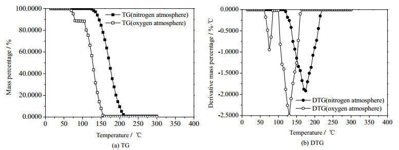 3.2 脱硫溶液的降解机理研究导致脱硫溶液降解的原因很多,一般可分为化学降解、热降解和氧化降解三种。由于N-甲基二乙醇胺是叔胺,既不会与硫化氢或二氧化碳生成噁唑烷酮一类降解产物,也不会与氧硫化碳、二硫化碳等有机硫发生不可逆反应,即基本不存在化学降解问题,故本文利用同步热分析仪仅对N-甲基二乙醇胺在连续升温条件下的热降解和氧化降解过程进行了研究,其TG和DTG曲线如图 4所示。