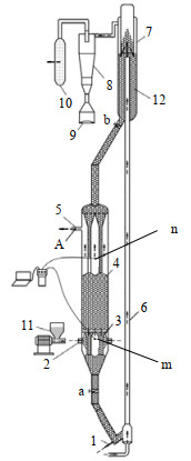 图 1 实验装置示意图 Fig.1 Schematic diagram of the experimental setup 1. loose wind inlet 2. inlet pipeline 3. guide cone 4. moving bed filter 5. outlet pipeline 6. rise 7. spouting regenerator 8. cyclone separator 9. hopper 10. dust filter bag 11. screw feeder 12. feeder bin a. valve b. regenerating valve |
