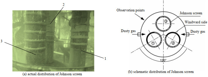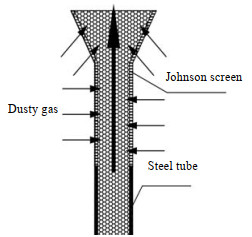 其次,装置内构件——约翰逊网导料锥,表面也存在粉尘沉积现象。含尘气体进入装置后,只能通过约翰逊网缝进入,在此处形成类似错流式移动床过滤器入口结构,如图 9所示。错流床过滤器一大特点就是在入口“屏障”表面会沉积部分粉尘,并形成滤饼,以此协助后续含尘气体的过滤。实验中发现,入口粉尘浓度越高,越有助于滤饼的形成,过滤效果越显著。