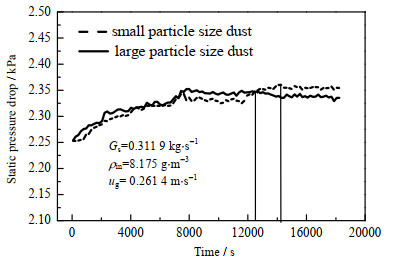 从图 12中可以看出,随实验的进行,两条压降曲线变化经历了两个相同的阶段。在初始阶段,随着实验的进行,床层压降逐渐升高,当实验进行一定时间后两条床层压降曲线趋于平稳,所不同的是进入平稳阶段所需的时间。两组实验进行相同时间后(约8 000 s),大粒径粉尘组床层压降进入平稳,而小粒径粉尘组压降仍随时间延长而增加。初始状态下,大粒径粉尘的床层压降高于小粒径粉尘,当实验进行约13 000 s时,小粒径粉尘组压降完成“反超”,随后达到平稳。