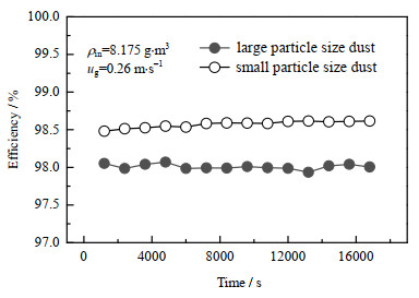 图 13为不同入口粉尘粒径条件下设备除尘效率随时间变化关系。从图中可以看出,使用小粒径粉尘条件时,除尘效率较大粒径粉尘提高0.5 %左右。