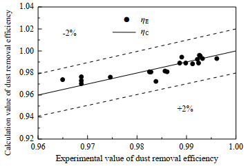 图 14 除尘效率实验值与拟合数据对比图 Fig.14 Comparison of experimental and fitting data of dust removal efficiency |