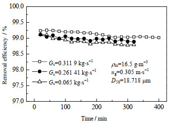 图 4 不同颗粒循环强度下除尘效率变化曲线 Fig.4 Profiles of dust removal efficiency under different particle circulation fluxes |