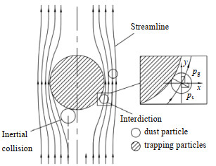 首先,对于本实验所选的操作条件范围,惯性碰撞和拦截作用被认为是主要的过滤机制[27]。颗粒间的相互作用如图 5所示。当拦截和惯性碰撞发生时,若粉尘的动量pg沿竖直方向的分量小于捕集颗粒所携带的动量ps沿竖直方向的分量,则碰撞后粉尘颗粒失去原有运动方向的速度,与捕集颗粒一同向下流动,实现粉尘的分离。除颗粒与粉尘自身质量外,颗粒流速与表观气速也是影响各自动量的主要因素。在表观气速一定时,粉尘所携带动量一定;当颗粒循环强度增加,意味着颗粒速度的增加及其所具有的动量随之增加,有助于提高捕集颗粒对粉尘的拦截和碰撞作用,从而提高过滤效率。