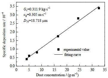 图 7 比沉积率随入口粉尘浓度变化曲线 Fig.7 Relationship between specific deposition rate and inlet dust concentration |