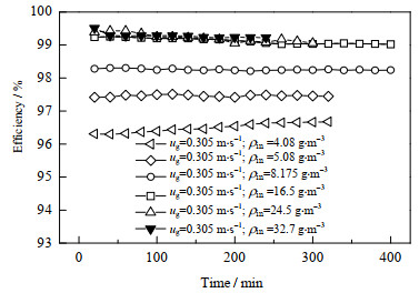 图 8 不同浓度下效率随时间的变化规律 Fig.8 Profiles of dust removal efficiency under different inlet dust concentrations |