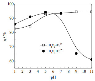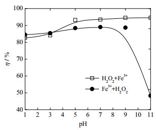由图 7可知,在先投加H2O2后投加铁离子的顺序下,OPD溶液初始pH值由1.0增加至11.3的变化过程中,Fe3+/H2O2类芬顿体系降解OPD污水的降解率分别为82.6%、84.1%、93.2%、93.5%、94.4%、94.5%,溶液的降解率随OPD污水初始pH值的升高而升高;Fe2+/H2O2均相芬顿体系降解OPD污水的降解率分别为85.9%、91.0%、94.3%、93.5%、65.3%、61.1%,溶液的降解率随OPD污水初始pH值的升高呈现先升高后降低的规律[30]。从图 7中还可以看出,在pH=1.0~7.8时,Fe3+/H2O2类芬顿体系的降解率低于Fe2+/H2O2均相芬顿体系的降解率,说明在酸性或弱酸性条件下,Fe3+对H2O2的催化活性低于Fe2+对H2O2的催化活性;在pH=7.8~11.3时,Fe2+/H2O2均相芬顿体系的降解率迅速降低,Fe3+/H2O2类芬顿体系的降解率仍略微提升,这说明在弱碱性或碱性条件下,Fe3+对H2O2的催化活性明显高于Fe2+对H2O2的催化活性,Fe3+/H2O2类芬顿体系表现出更优异的pH适应性能。这是由于Fe3+/H2O2类芬顿体系在弱碱性或碱性条件下,部分Fe3+发生了催化H2O2产生HO2·和·OH等自由基降解OPD的均相反应(式(4)~(8));部分Fe3+在溶液中发生了水解反应(式(9)),转化成了悬浮在溶液中的Fe(OH)3胶体粒子,具有吸附性能的Fe(OH)3胶体粒子与H2O2发生异相界面反应(式(10)~(11)),产生HO2·和·OH等自由基,增强了Fe3+/H2O2类芬顿体系的降解性能。而Fe2+/H2O2经典芬顿体系在pH值接近或高于7时,溶液中的Fe2+以氢氧化物的形式沉淀而失去催化能力[31],造成Fe2+/H2O2均相芬顿体系在高pH值条件下的降解性能迅速下降。
