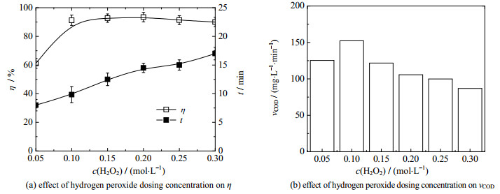 3.2 H2O2投加浓度的影响如图 2所示为H2O2投加浓度c(H2O2)对Fe3+/H2O2类芬顿降解OPD污水性能的影响,反应条件:OPD污水浓度为0.04 mol·L-1,θ0=30 ℃,pH=7.8,Fe3+投加浓度为10 mmol·L-1,H2O2的投加浓度范围为0.05~0.30 mol·L-1,药剂投加顺序为“H2O2+ Fe3+”。