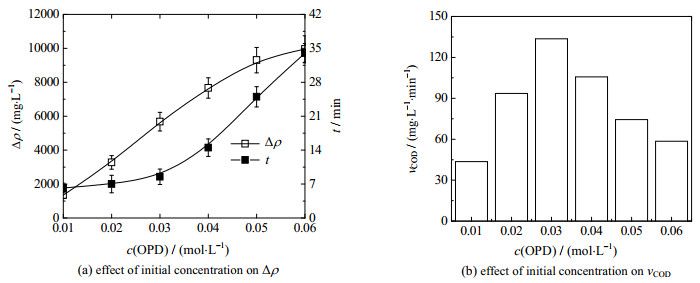 3.5 OPD浓度的影响如图 5所示为OPD污水初始浓度对Fe3+/ H2O2类芬顿降解OPD污水性能的影响,反应条件为:OPD污水体积为300 mL,θ0=30 ℃,pH=7.8;H2O2投加浓度为0.2 mol·L-1,Fe3+投加浓度为10 mmol·L-1,OPD污水初始浓度c(OPD)=0.01~0.06 mol·L-1,药剂投加顺序为“H2O2+ Fe3+”。